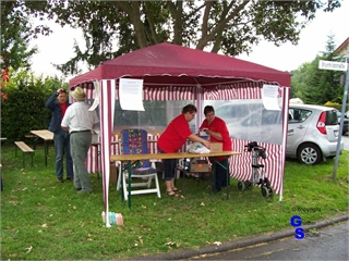 Unsere Damen kümmerten sich in der Anmeldung um die Fahrer, damit diese auch Ihre Flasche Wein und den Gutschein vom Verkehrsverein bekamen. Als sich die ersten der Traktorparade sich durch den Strengelweg und Im Himmeltal dem Kellerweg nährten, wurde der Regen heftiger.
