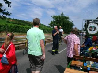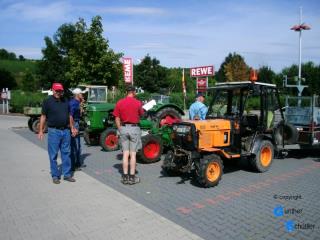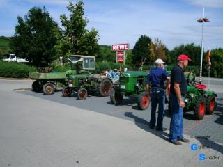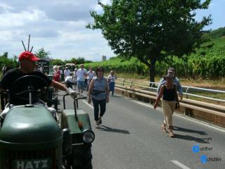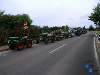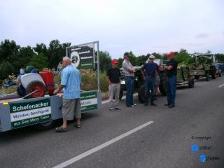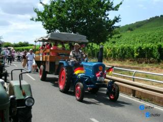 So trafen wir uns in Guntersblum auf dem REWE Parkplatz und reisten mit 8 Fahrzeugen nach Nierstein um Flagge zu zeigen. Sehr schön sind die Landmaschinen der "Altrheiner" die fest auf den Wagen aufgebaut sind. Schon in der Startaufstellung kamen wir mit vielen Leuten in Kontakt. Die Aufstellung erfolgte in umgekehrter Reihenfolge, so konnten wir auch alle Teilnehmer sehen. Bei den Traktorfreunden Rhein-Selz gab es dann auch ein heftiges Hallo, man kennt sich eben von vielen Veranstaltungen. Beim Zug durch die noch junge Stadt ernteten wir viel Beifall, das war uns dann auch die eine oder andere kleine Ehrenrunde wert. Aber alles geht einmal zu Ende, so fuhren wir nach dem Festzug unserem Stammlokal entgegen und saßen im Rheinterrassenhof in Guntersblum nach diesem wunderschönen Tag noch etwas beisammen |