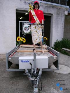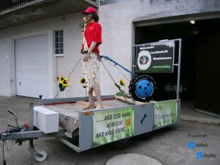 Das Motto war schnell gefunden: ....mer esse kaan Honisch, mer kaue Biene.... Außer dem Motto gab es auch Rahmenbedingungen, der Wagen sollte auch für die anderen Festzüge 2014 tauglich sein, und außerdem hatten wir uns da schon für die Solo Motorsense entschieden. Diese ist jedoch nicht so einfach zu verstehen, so schafften wir uns eine Schaufensterpuppe an um die Handhabung zu verdeutlichen. Zu diesem Zeitpunkt waren dann Alle mit der Gestaltung des Wagens beschäftigt. Es wurde geschraubt, bestellt und genäht..... ....Wurfmaterial organisiert und mit Bedacht ausgewählt was wir noch kaufen mussten Es sollte ja ein durchgängigen Sinn ergeben.