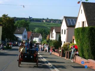 Es ging ganz langsam durch die Dorfstraßen, viele Erinnerungen wurden bei den Zuschauern geweckt. Als Fahrer hat man ja andere Aufmerksamkeiten aber Kommentare wie "so hatte ich auch einen" oder viele befassten sich auch mit den Wagen. Dies ist das Schönste was man bei einem Festzug erleben kann. Auch die Presse hat sich wieder mit uns befasst, schade Hartmut, Dein Hund Tina wurde namentlich erwäht, Du nur als Herrchen. Zum Abschluß stoppten wir nochmals nach Mölsheim. Bei einem herrlichen Blick über Wachenheim stärkten wir uns für die Heimfahrt. |