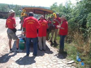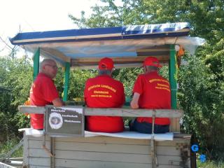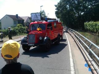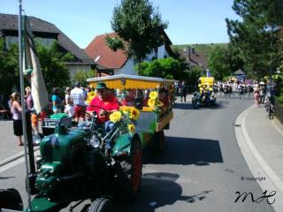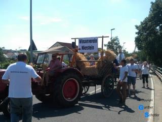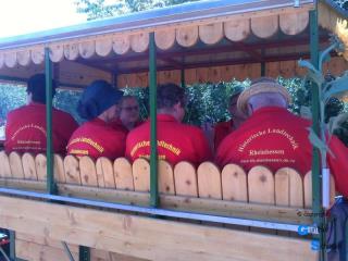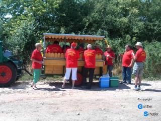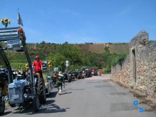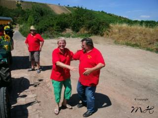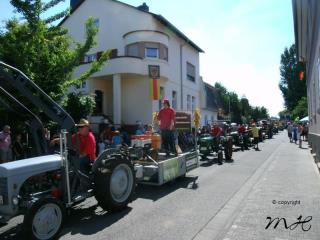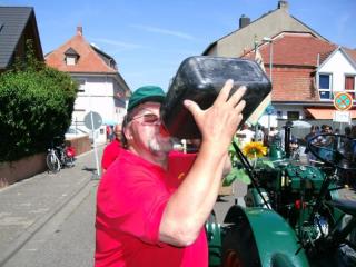 Der Veranstalter wollte, dass die Aufstellung bereits um 13:00 Uhr beendet ist, das bringt Ruhe vor dem Start. Diese Ruhe nutzten wir für einen kleinen Imbiss und auch ein Tänzchen durfte nicht fehlen. Dann endlich ging der Zug los, wir hatten noch Zeit den Zug zu beobachten, wir waren die Zugnummer 62 von ca 90 Zuggruppen. Super Stimmung in den Straßen der Stadt, viele nette Kontakte ja das macht Spaß. Herbert mußte bei seinem Allgaier hin und wieder Betriebsstoffe nachtanken, keiner wollte es glauben, es war tatsächlich Wasser. Dies demonstrierte er dann auch eindrucksvoll. Natürlich ist es nicht einfach mit einer so großen Gruppe noch einen ordentlichen Abschluß zu finden, dazu brauchen wir Parkfläche. Wir entschieden uns für den Rheinhof in Guntersblum, es war eine gute Entscheidung. Der Rheinhof ist ein Ausflugslokal direkt am Rhein, da treffen sich Radfahrer und Wanderer zur Rast. Für diese war es ein willkommenes Ereignis die historischen Traktoren und Landmaschinen in aller Ruhe von der Nähe zu sehen. Beim Wegfahren hörte man noch Gespräche zu diesem Thema. |