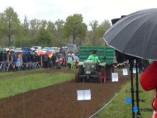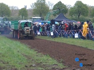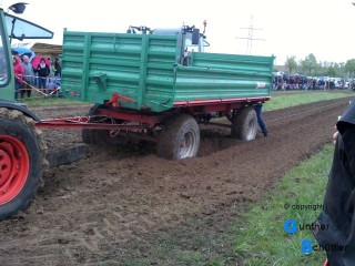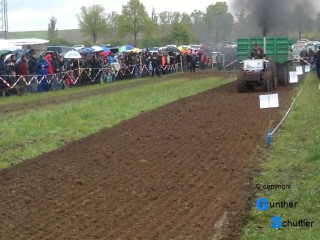 Ja da ist dann auch noch das Wörtchen Rheinhessisch, ja was soll das bedeuten.... die Neugier ist geweckt. Das ganze Wochenende waren die Akteure zugange und am Montag den 1. Mai gab es die Endläufe. Leider spielte das Wetter nicht mit, so reisten wir mit dem Auto an, nach 20m waren wir durch den Lehm an den Schuhen schon 2cm größer. Was wir sahen war dann auch wirklich sehenswert. Um es vorweg zu sagen es gab keine spezielle Pulling Schlepper, nein es waren seriennahe Fahrzeuge die in verschiedenen Klassen starteten. Der Bremswagen war schon eine tolle Sache und machte es für die Fahrer nicht leicht. Man verwendete eine normale Ackerrolle der Firma Unsinn der man die Luftdruckbremse mit einem Kompressor immer weiter zudrückte.