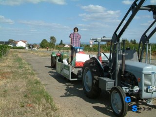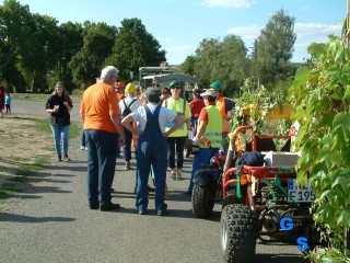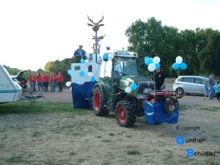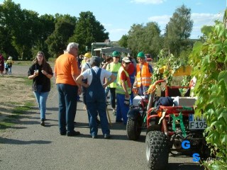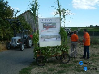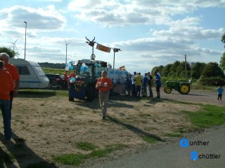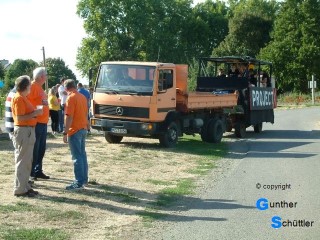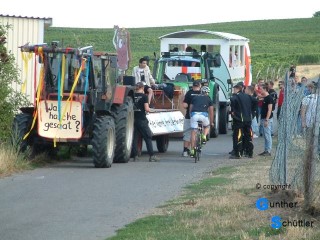So fuhren Marco und ich in Guntersblum los, wir wollten auch dabei sein. Es wurde eine schöne Fahrt durch das herrliche Hügelland. Rechts und links der Straßen die Weinberge mit den ungewöhnlich früh gereiften Traben, einfach wunderschön. Nach einer Rast mit Weck und Worscht fuhren wir zum Sportplatz in die Startaufstellung. Viele Bekannte und nette Gespräche verkürzten die Zeit bis sich der Zug in Bewegung setzte.