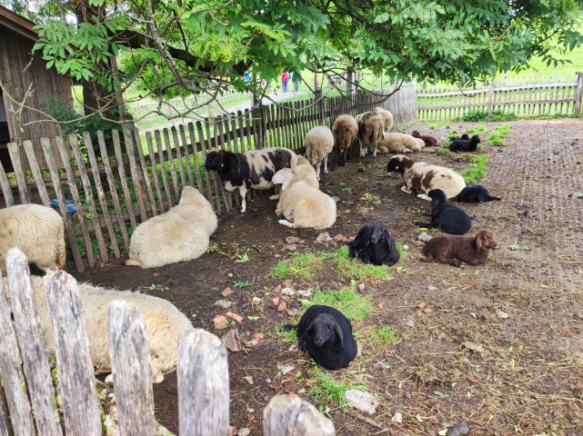 nichts Gutes verheißt. Letztendlich gelang es doch noch einen freien Platz auf dem weiter abgelegenen Parkgelände zu bekommen. Der leicht ansteigende und relativ lange Fußweg zum Museum war schon mit Bauernhoftieren aus Holz mit den dazugehörenden Erklärungstafeln ausgestattet. | ||||