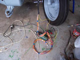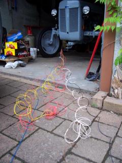 Die einzelnen Adern habe ich an Lampen, Lichtmaschine, Zündung und Steckdose angeschlossen und in Richtung Schleppermitte auf dem Boden ausgelegt. Anschliessend habe ich Schrumpfschlauch abgelängt, dass er etwas weiter reicht wie der nächste Abzweig. Dann ging es an den nächsten Abschnitt, der begann einige cm vor dem Ende der Schläuche vom letzten Abschnitt.