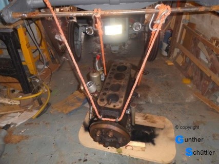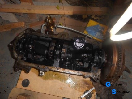 Nun sollten die Laufbüchsen raus, aber die wehrten sich. Bei Kontakten mit dem Peugeot Forum stellte sich noch heraus, dass es sich wahrscheinlich um einen Peugeot 403 Motor mit Peugeot 203 Zylinderkopf handelt.