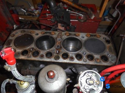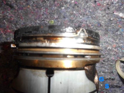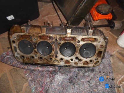 Der erste Ansatz war den Zylinderkopf abbauen um sich ein Bild über den Zustand des Motors zu machen. Bekannt war bis zu diesem Zeitpunkt lediglich ein geringerer Kompressionsdruck des Zylinders 1. Die Zylinderkopfdichtung zeigte an der Oberseite Verformungen, also muß der Kopf geplant werden. Bei dieser Gelegenheit wurden auch alle Ventilführungen überprüft und die Ventilsitze bearbeitet. Dies geschah bei der Firma Reese in Mainz. Auch erklärte mir Herr Reese, die Probleme kommen todsicher nicht vom Zylinderkopf, ich solle mir mal die Kolben und Büchsen anschauen.