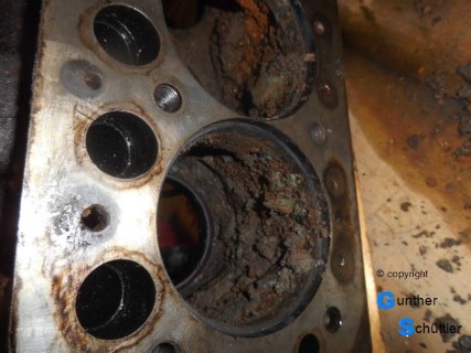 den Zylindern 1+2 war jede Mengen Schmutz zu finden. Auch waren die Wasserkanäle zum Zylinderkopf verschlossen bzw. nicht völlig offen. Die Verschmutzung war so fest, dass nur der Akuschrauber mit entsprechendem Bohrer half. Damit kann ich mir erst einmal die Temperaturprobleme erklären.