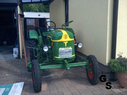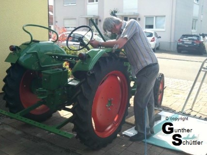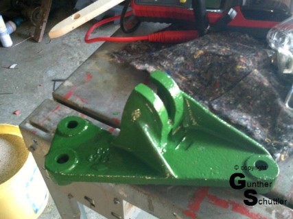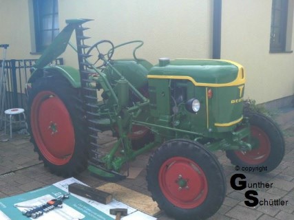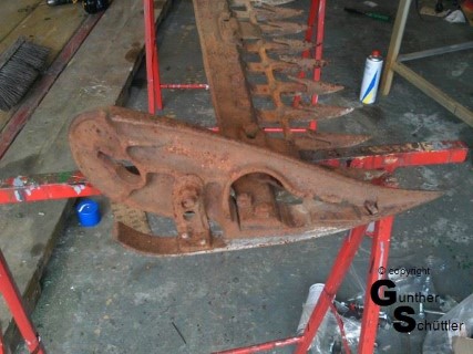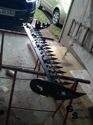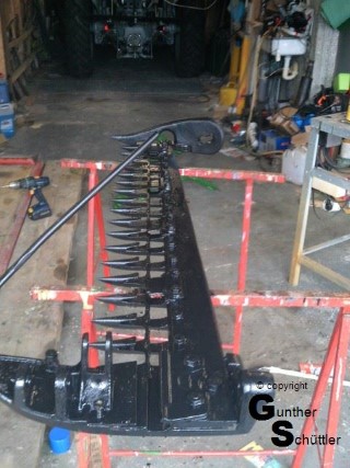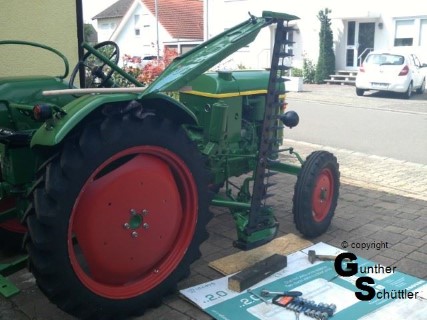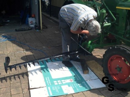 Deutz hat das gut gemacht, man kann die Antriebswelle trennen und unter lautem fluchen die Riemen dann bis zu ihrem Platz bewegen. Fluchen soll ja gesund sein aber das sind die Momente in denen man Leute hasst, die auch für einfache mechanische Dinge zu .... sind. Letztendlich war dann das Mähwerk angebaut und der Antrieb hergestellt. Die automatische Ein/Aus Kupplung justiert, Fehlteile nachgebaut und auch das Mähwerk neu lackiert.