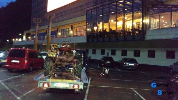 Die Bereifung hatte ihre Zukunft auch schon lange hinter sich gelassen, beim Aufladen verabschiedete sich dann auch noch ein Vorderreifen. Mein Gedanke war nur noch wenn ich den verzurrt habe und die anderen Reifen platzen auch, dann sind die Gurte locker und es wird kritisch. Soll ich die Luft ablassen? Nein ich habe ihm viel Aufmerksamkeit während der Fahrt geschenkt und an der Koblenzer Brauerei nochmals überprüft, es sah gut aus. Beim Abendessen sahen wir dann, wie er die Aufmerksamkeit der Leute auf sich zog......