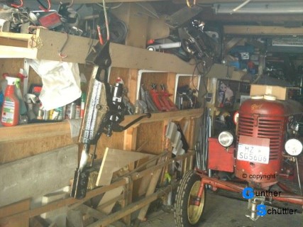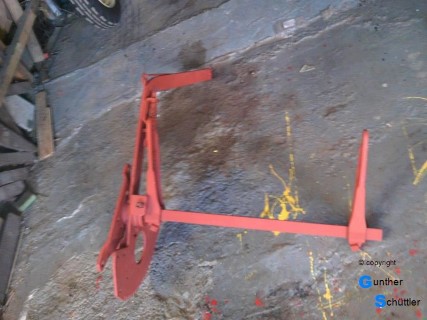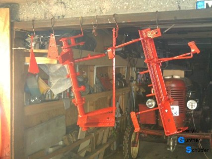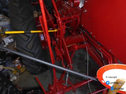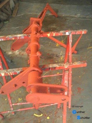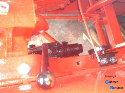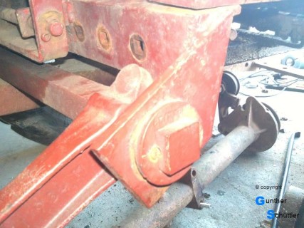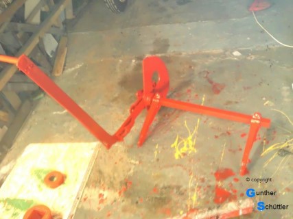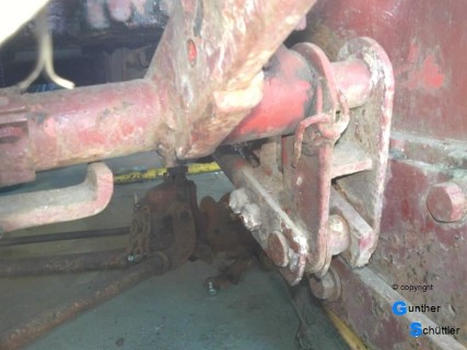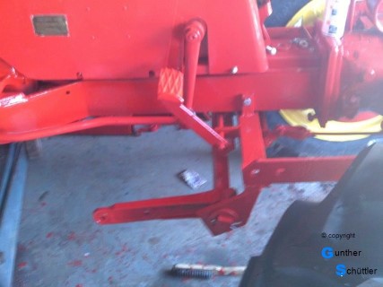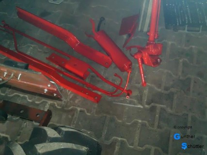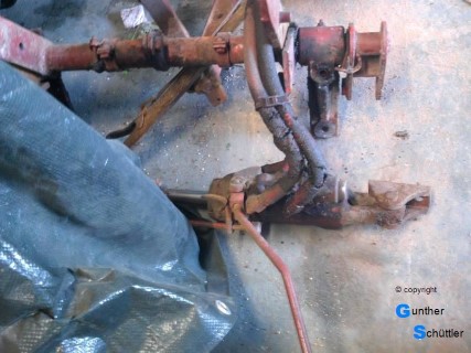 Die Konstruktion des kleinen Schleppers mutet zwar etwas gewöhnungsbedürftig an, ist jedoch durchdacht. Was fehlt ist lediglich die in dieser Zeit zukunftsweisende Dreipunktaufhängung. Im Übrigen ist ein Zwischenachsanbau und ein Heckanbau möglich und werden mit dem gleichen Hebel mechanisch ausgehoben. Je nach Gewicht des auszuhebenden Gerätes handelt es sich dabei wohl um muskelbildendes Eisen. Ein Mähwerk lässt sich jedoch sehr schwer ausheben, so war bei diesem Pony eine Hydraulikanlage verbaut. Die Zwischenachsgeräte werden mit dem für das Pony obligatorischen Hebel ausgehoben. Vermutlich wurde damit auch der Neigungswinkel des Mähwerkes verstellt. Für diese Verstellung habe ich allerdings einen eigenen Hebel eingebaut, damit ist das alles nicht so wackelig, wahrscheinlich wird dieses Fahrzeug mehr auf dem Anhänger reisen, Damit hat die Stabilität Vorrang vor der Originalität.