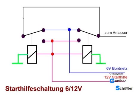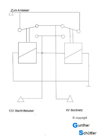 Das Pony war dann soweit fertig, der SIMCA Motor erwies sich als sehr startfreudig. Leider war der Anlasser nicht so spannungtolerant wie ich mir das gewünscht hatte. Mit weniger wie 6,5 Volt war nichts zu machen. Das ist zwar nur das Problem eines einzigen Bauteils, dem ich bei entsprechender Behandlung auch noch eine Besserung zutraue. Aber es zeigt ein viel größeres Problem auf. Der kleine Schlepper wird nie lange laufen, dass die Lichtmaschine die Batterie wieder in den "Gute Laune Modus" versetzt. Somit wird des öfteren externe Starthilfe notwendig werden. Aber 12V Fremdspannung an eine 6V Batterie kann echt der Knaller werden. Weiterhin sind in diesem Fall die Ladekontrolllampe und die elektronische Zündung bedroht. Eine Prozedur entwickeln um den Anlasser vom Bordnetz zu isolieren und nur diesen mit 12V zu beglücken ist nicht ausreichend sicher. Also muss eine Schaltung her die das denken auf zwei Farben beschränkt.....
