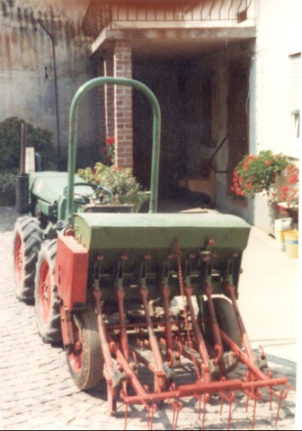 Die Drillmaschine wurde von meinem Großvater gekauft und auch über die Kriegszeiten war sie im Einsatz. Damals noch von Pferden gezogen. Mit dem Fortschreiten der Motorisierung übernahmen Traktoren die Arbeit der Pferde. So setzte mein Onkel dann diese Drillmaschine mit dem lenkbaren Vorderwagen hinter einem Holder B10 ein. Dies war doch etwas umständlich. So fertigte mein Vater eine Anhängeöse, für einen möglichen Rückbau war dies kein Hindernis. Außerdem bekam sie auch noch Spuranreißer Scheiben. Nach 1961 kaufte dann mein Vater diese Maschine und spannte den Holder A12 davor. Auf dem Standbrett waren dann auch einige ältere Schulkameraden mit der Überwachung der einzelnen Rohre im Einsatz. Später dann auch mein Bruder und ich. So zog der kleine Holder seine Bahnen bis der Hela D230 nach einem Totalschaden wieder zum Einsatz als Pflegeschlepper kam. Wieder erfolgte ein Umbau, auch dieser war so ausgelegt, dass die Maschine wieder zum Pferdezug rückbaubar war. Die 1,75m waren für den Schlepper jedoch zu wenig, so verbreiterte mein Vater die Maschine um 25 cm, die 12,5 auf der einen Seite waren unproblematisch während die Antriebsseite doch etwas Aufwand bedeutete. So war sie dann viele Jahre auf die Hydraulik aufgesattelt...... bis die größere Nachfolge anstand. Da war das Ende schon zum greifen nahe, schade schöne Maschine. Aber es kam dann doch anders, es begannen erste Versuche mit der Reihenbegrünung im Weinbau. Wieder war ein Umbau angesagt. Mein Vater hat die Teile zusammengesucht und gerechnet ob das auch funktionieren kann. Nach dem Umbau (1981) in die jetzige Form war dann auch kein Rückbau mehr vorgesehen. So tat sie dann ihre Dienste auch für andere Winzer bis die Rebzeilen immer breiter wurden. Nun stand sie im Schwerlastregal und machte einen traurigen Eindruck, zum verschrotten hat sich mein Bruder (noch) nicht durchringen können. Nachdem wir nach solchen Stücken Auschau hielten bekam ich sie von meinem Bruder..... ......und wieder fand die Verschrottung nicht statt. In einer wunderschönen Fahrt haben Hartmut und ich die Maschine mit dem Schlepper abgeholt. |