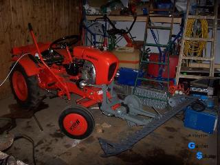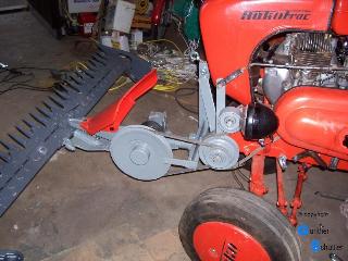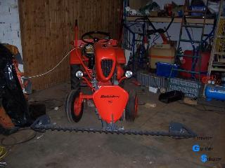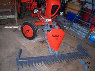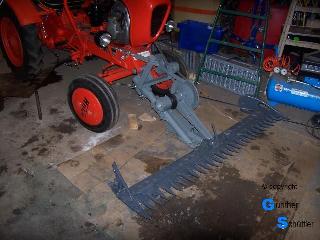 ......in diesem Bild sieht man den überhöht ausgehobenen Mähbalken, der über die Bordwände des Anhängers reichen muß.......